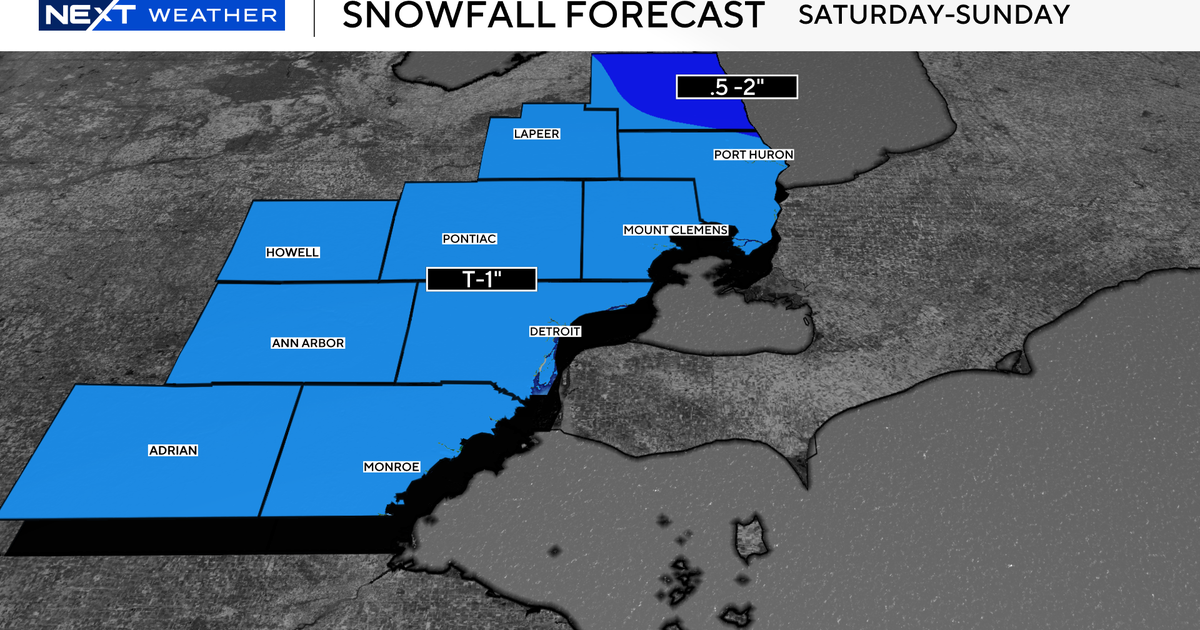 19+ hour, 19+ min ago (170+ words) December 5, 2025 / 1:00 PM EST / CBS Detroit Southeast Michigan has a couple of chances for snow over the weekend." Friday night, a cold front moves through, bringing a chance of some flurries and leaving a dusting of snow, mostly in the northern third of the area. There is a slight chance of seeing some freezing drizzle if enough warm air moves in. On Sunday morning, a quick low-pressure system moves through the area, bringing a better chance of accumulation. High pressure and cold air from the north may hold most of the snow south of the state line, but nearly everyone has a chance to see anything from a trace of snow to an inch by Sunday afternoon. Cold air continues to move in through Sunday, so if you don't venture out on Sunday, leave some time for scraping/defrosting on Monday…...